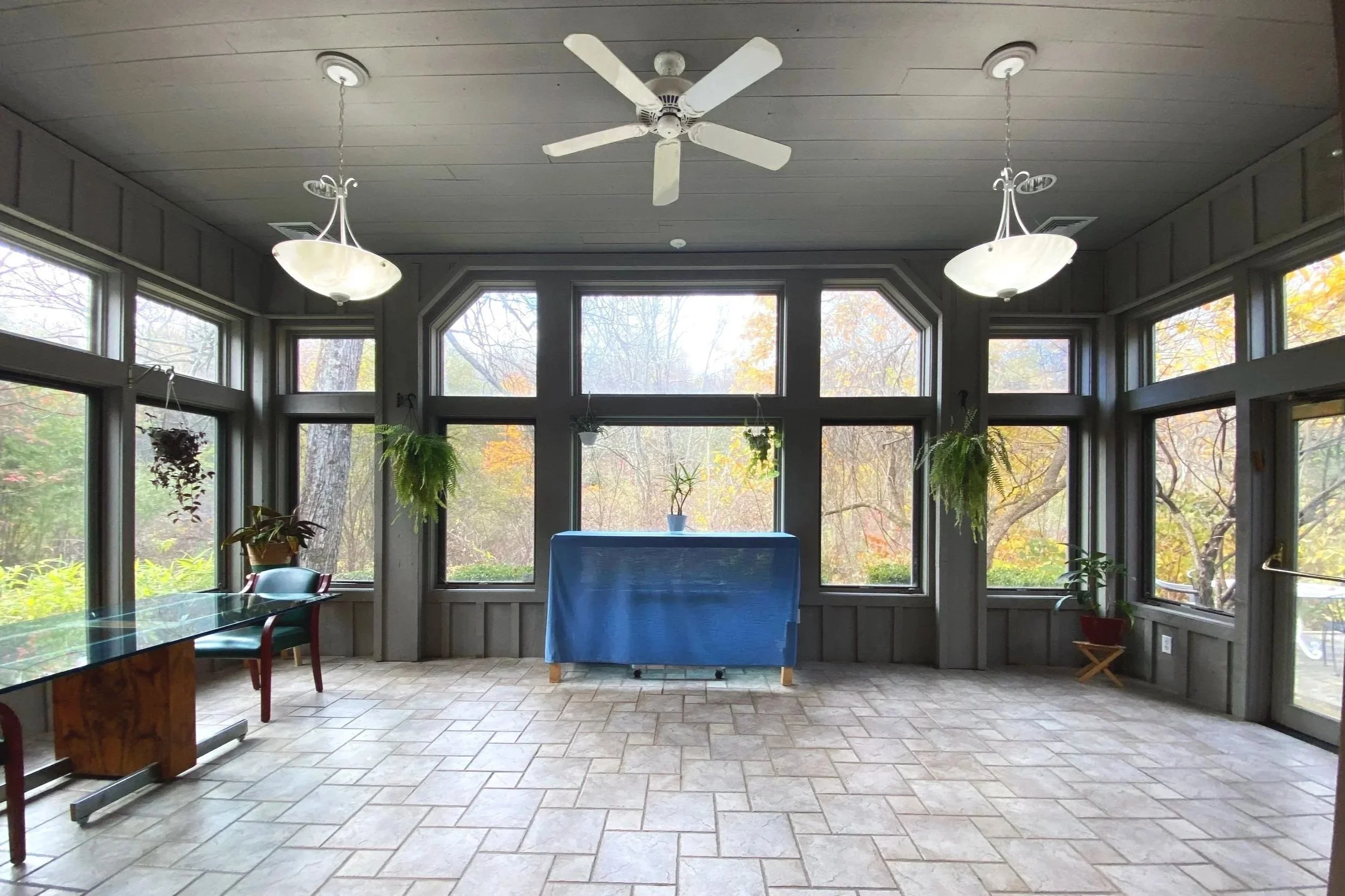 Our garden room is full of windows and opens outside to our patio area. A favorite space in the warmer months!